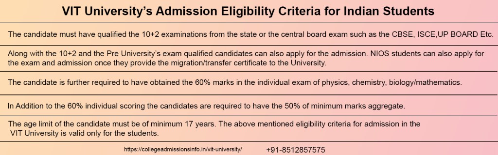 Admission into VIT is by methods for the VITEEE assessment led each year. The students dependent on their legitimacy are given a scope of alternatives to seek after their under graduation degree. The Institution at present offers 36 undergrad programs comprehensive of B.Arch degree (5 years) program for understudies ready to seek after Architecture. Entrance into design is from NATA scores.