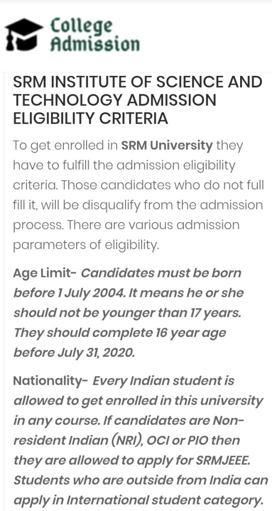 Also, the SRM University Fee Structure for students have different criteria is for B.Tech – 1,70, 000/- M.Tech – 1,00,000/- MBA – 15,000/-, and PGDM – 10,000/-. Apart from it, SRM University Admission Eligibility Criteria for Students that the students qualified in 10+2 in the science stream with a minimum of 60% marks is required. For more information visit our website link.